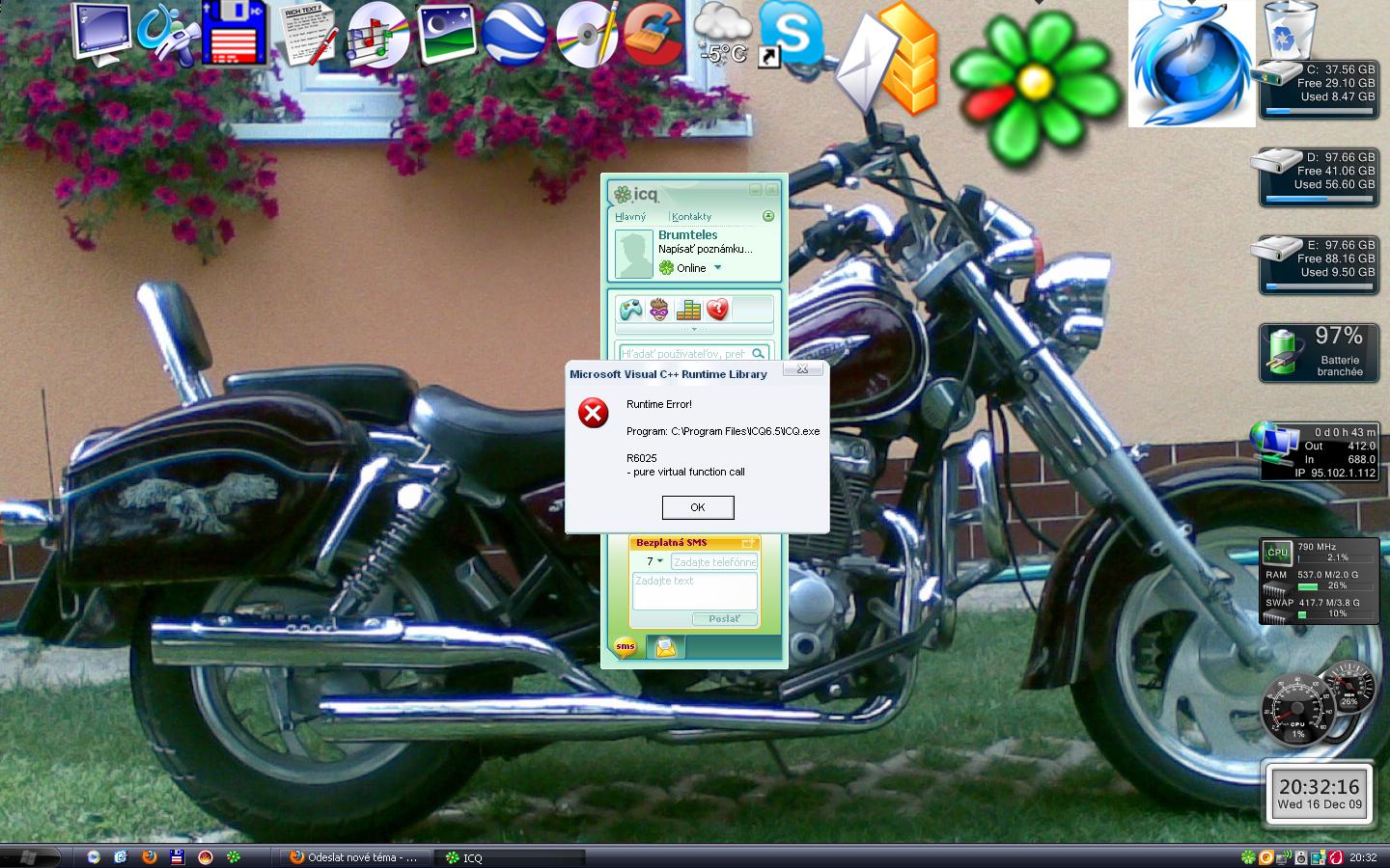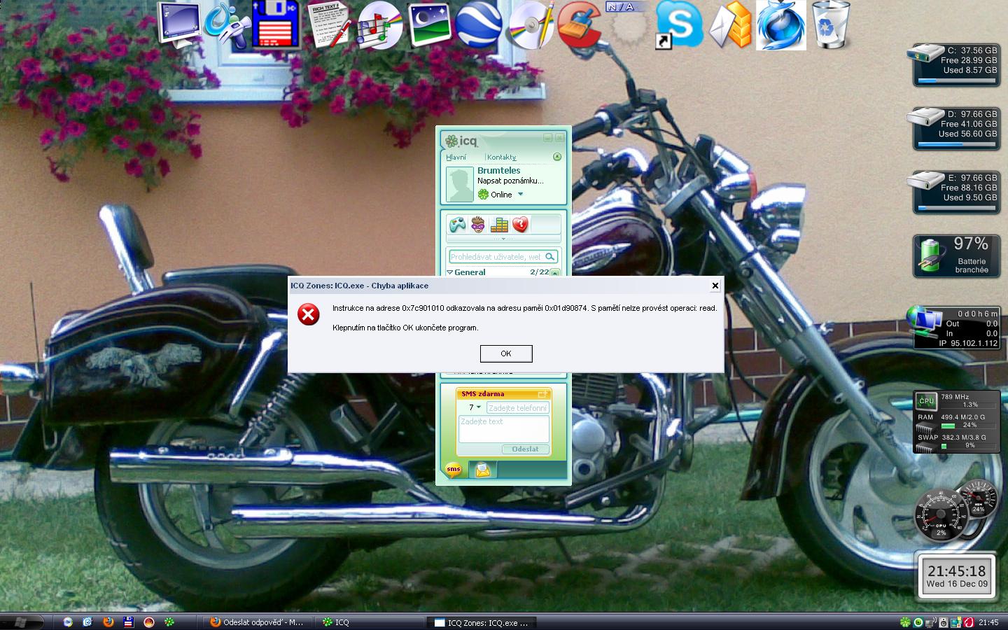 Dobrý večer. Od včera riešim takýto problém. Po preinstalovaní víst na notb. za win XP som nainštaloval ICQ, prihlásil sa k svojmu účtu a asi 10-15 sekúnd po spustení mi nabieha chybová hláška viď screeny.