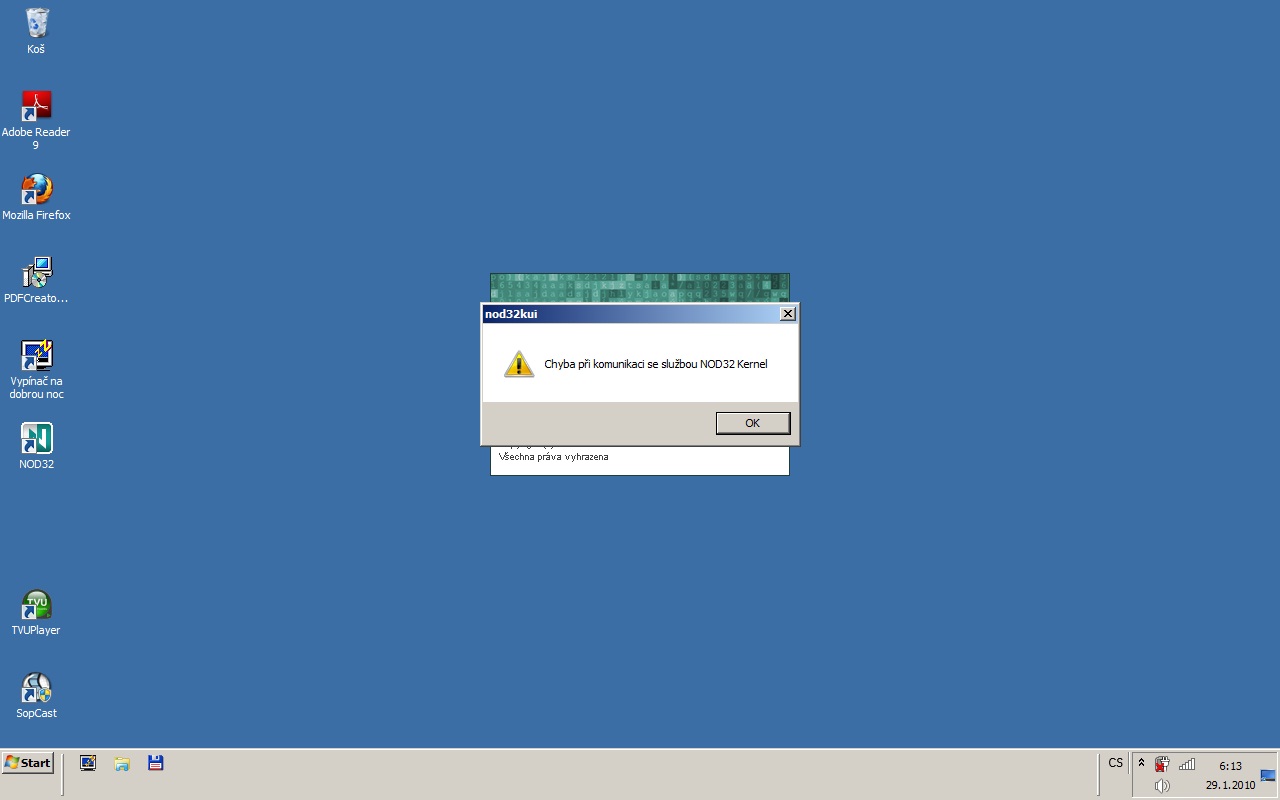 A tu kontrolu jsem chtěl proto, protože nemám v pořádku antivir. Mám nainstalovaný cracklý NOD 32, ale je to verze pro XP. A to asi hapruje. To se projevuje v tom, že NOD asi nefunguje (viz přiložený obrázek, který se zobrazuje při startupu) a nejde mi odinstalovat-ani přes odebrat program z panelu nástrojů, ani ze startmenu, kde je složka NODu s možností uninstall.
