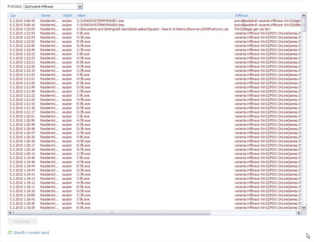 *p.s.: v přiloze zasílám printscreen protokolu z NODu - při rezidentní ochraně mě našel opakovaně soubor fk.exe "OTV trojský kůň" - opakovaně se kopíroval z disku na disk, antivir jej nestačil mazat... (tento soubor se mi objevil v PC dne 5.3., poté mi nešly otevírat disky)