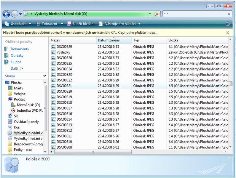 V tom hledani se to radi tak, ze nahore jsou vzdycky slozky a az pak zacinaji primo soubory (na tech obrazcich je vzdy napsano ve sloupecku Typ - slozka souboru). Zkuste sem dat jeste obrazky primo nejakych souboru (jako Typ tam bude bud aplikace, nebo obrazek, dokument atd.). A mrknete u nich taky na velikost. Pokud tam nepujde primo zobrazit, muzete tady pak Rudymu napsat, ktere z nich jsou nejvetsi. Sice nevim, jestli to k necemu bude, ale za zkousku nic nedate