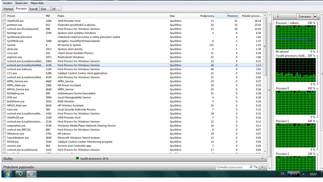 Tak to byl ten legitimní. Někdy to je vir. Problém je ten, že konkrétní procenta u jednotlivých procesů nejsou uvedena. Mne zajímá ten proces, který z největší části procesor vytěžuje. Takto budete muset (kromě systémových procesů) vypínat jeden po druhém a zkoušet, který to způsobuje.