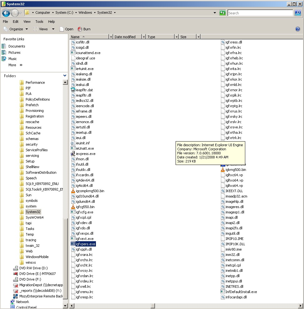 Prosím o pomoc s kontrolou počítače. Zdá se mi poslední dobou pomalejší, v task manageru se objevuje igfxpers.exe (jde killnout) z Windows\System32, nicméně tam je vidět jen občas a nejde např. nabrowsit pro kontrolu na virustotal.com. Dříve se myslím neobjevoval. Počítač je notebook Lenovo ThinkPad W500 s ATI Mobility Radeon HD 3650. Přikládám log z RSIT a screenshot System32.