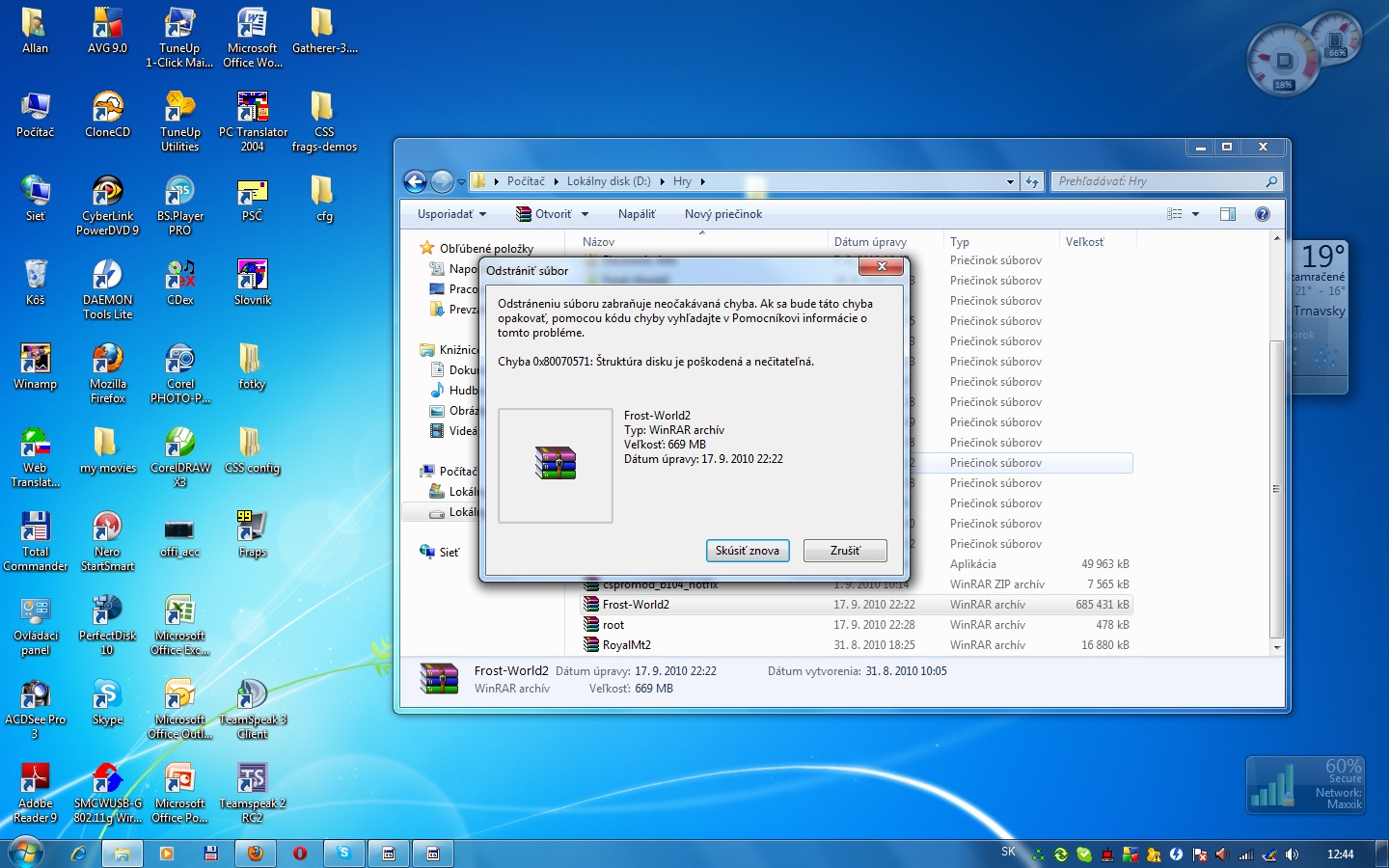 Zdravím. Neviem čím to je, ale dosť často sa mi stáva, že ked chcem niečo odstrániť z "D-čka", tak mi to vypise: Chyba 0x80070571: Štruktúra disku je poškodená a nečitateľná. Skúšal som už aj radu z http://windows.microsoft.com, ale mi to nepomohlo. Disky som dal oba skontrolovať a žiadne chyby to nenašlo, tak som sa rozhodol napísať sem. Pridávam screen: