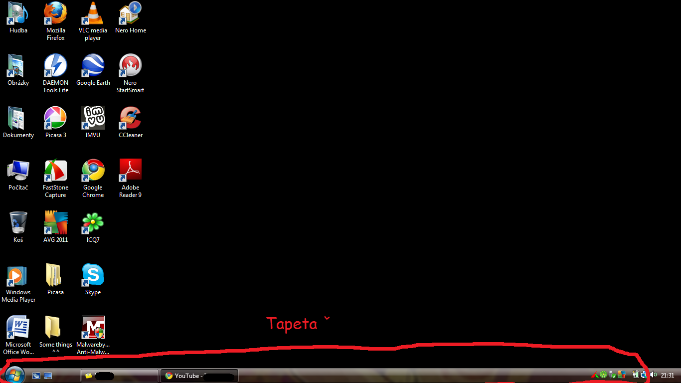 Jednou mi vlezl na PC nevlastní otec a prostě chtěj si [asi] projet funkce visty....a zdřejmě chtěl změnit tapetu...no a já druhý den přišla na PC a prostě černý pozadí....když změnim tapetu tak se mi oběví jenom na dolní liště a když vypínám PC zkoušela jsem založit nový účet a vše ok docela dost by mě to zajímalo....protože mě to brutálně štve