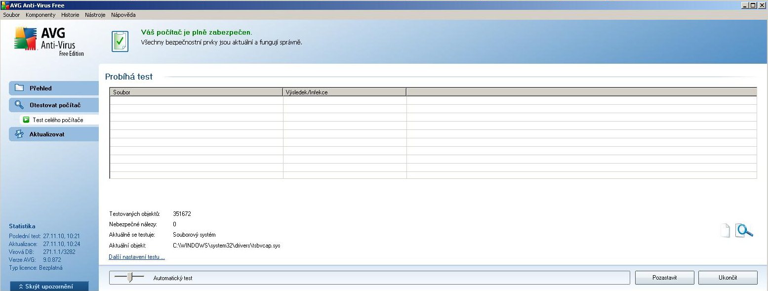 Manželka (kdo jiný že :mrgreen: ) stáhla ze Skype nějaký soubor exe. Zprovu AVG free hlásil a mazal vše co potom našel. Vždy ve složce TIF a nebo "system32". Vše jsem dával do trezoru. Nyní se AVG vždy sekne (viz obrázek) a nejede dál a nic nehlásí. Stejně tak AVAST (sek při 10%) i nějaký online program na kontrolu (Eset online skener - sek při 98%)