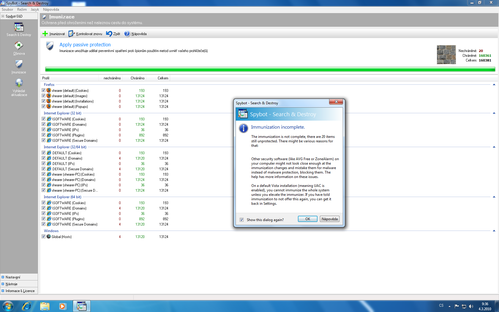 Zdravim, už pár dní mi správce úloh ukazuje vytížení fyzické paměti okolo 25% i když nemám nic spuštěnýho. Znatelně to zpomaluje kompa. Pravidelně aktualizuju jak Avasta, tak Spybota jako firewall mám default wokňáckej 7. U toho Spybota mám problém při imunizaci, viz příloha. Jinak Avast ani Spybot při kontrole nic nehlásej. Dost často mi také dochází k padání okna exploreru. Díky moc z rady.